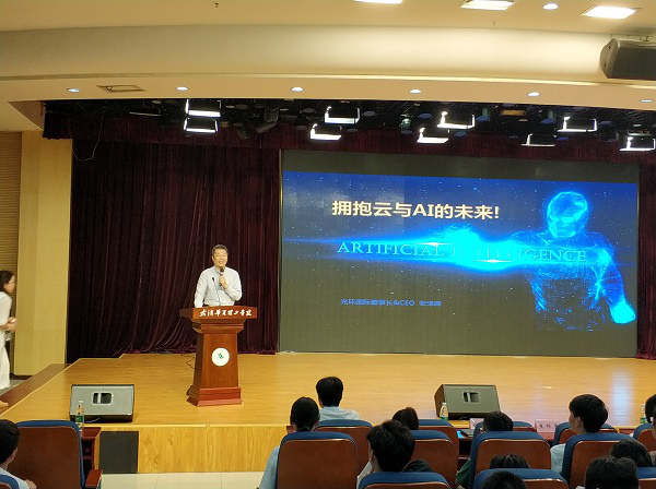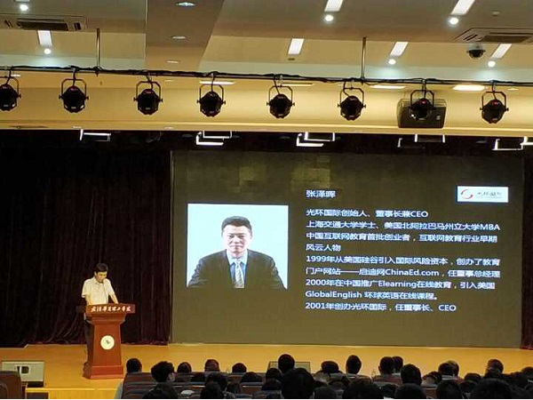 2018年5月24日,光環(huán)國際教育創(chuàng)始人兼董事長張澤暉來到武漢華夏理工學院,為該校學生帶來一場《擁抱云與AI的未來》主題講座, 600余名師生現(xiàn)場聆聽。