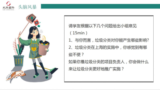更多的是大家在思考,作為項目經理的大家,可以作為垃圾分類的項目負責人,能夠如何更好的推動垃圾分類?大家認為可以從做好科普宣傳,包括宣傳冊、視頻學習、電視宣傳等等;是否可以將濕垃圾就地處理?如成為公共綠化的肥料、沼氣池?獎懲結合,適宜補償;建立權威的垃圾分類查詢器,統一口徑;完善基礎設施等五個方面著手;