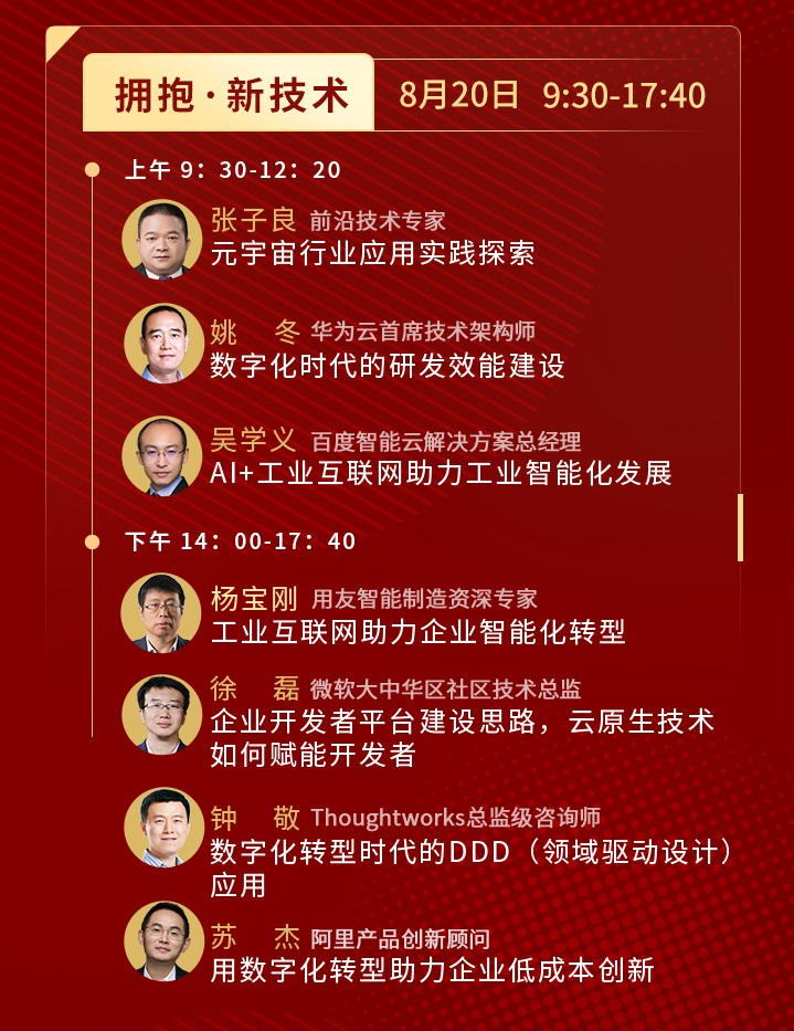 前沿技術專家張子良老師、華為云應用平臺部首席技術架構師姚冬老師,百度智能云智慧工業事業部解決方案總經理吳學義老師、用友智能制造資深專家楊寶剛老師、微軟大中華區社區技術總監徐磊老師、Thoughtworks總監級咨詢師鐘敬老師、阿里產品創新顧問蘇杰老師。7位影響力嘉賓全球在線直播登臺分享。