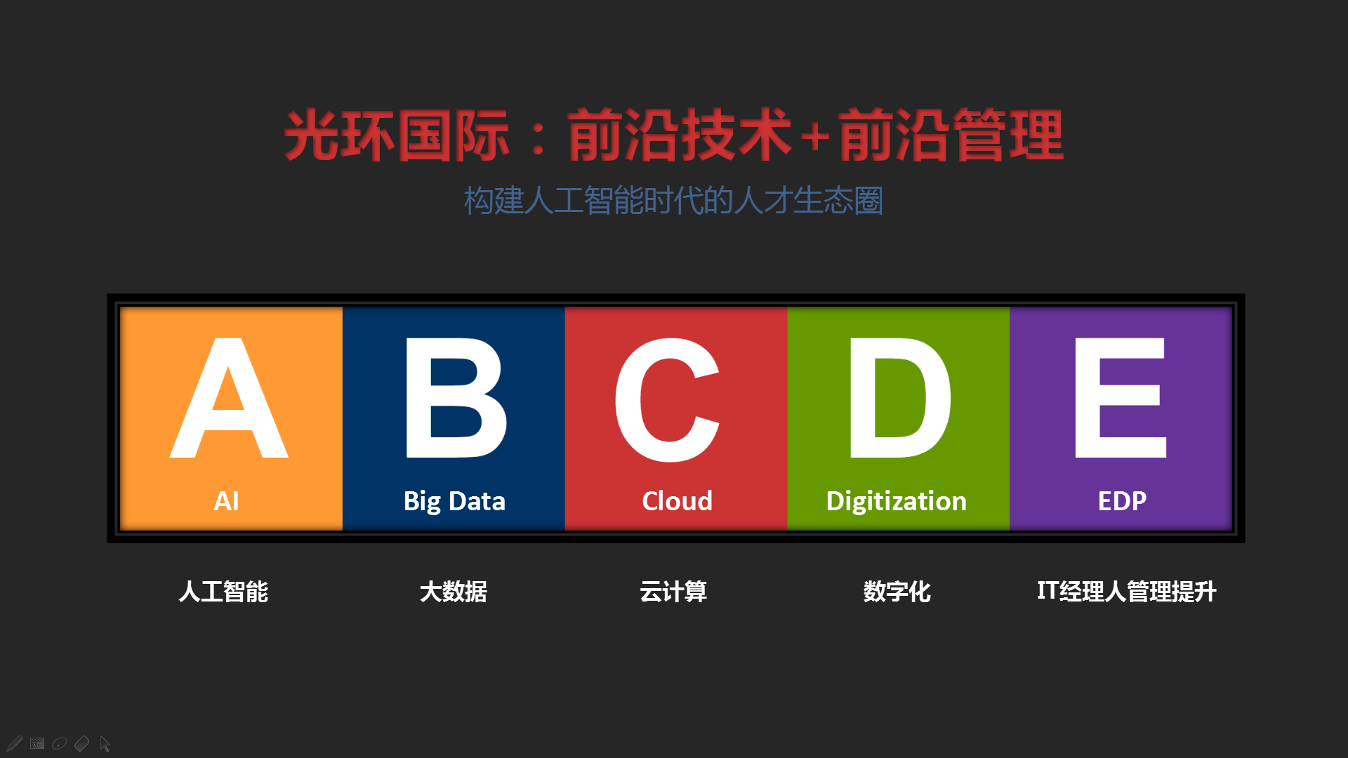 光環(huán)國際立足前沿,提前五年在大數(shù)據(jù)人工智能教育產(chǎn)業(yè)進(jìn)行布局,最終在2018年年初整合強(qiáng)勢(shì)業(yè)務(wù)板塊,正式對(duì)外發(fā)布 " ABCDE " 的業(yè)務(wù)布局。其中 " A " 為人工智能(AI)、" B " 為大數(shù)據(jù)(BIG DATE)、" C " 為云計(jì)算(CLOUD)、" D " 為企業(yè)數(shù)字化轉(zhuǎn)型培訓(xùn)(Digital Transformation)、" E "為IT經(jīng)理人管理能力提升(EDP)。對(duì)于未來,光環(huán)國際將通過前沿技術(shù)和前沿管理雙輪驅(qū)動(dòng),助力企業(yè)合作伙伴轉(zhuǎn)型為真正的科技創(chuàng)新、管理創(chuàng)新型企業(yè),與眾合作機(jī)構(gòu)共同構(gòu)建人工智能時(shí)代的人才生態(tài)圈。