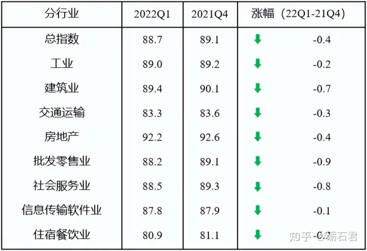 中國(guó)中小企業(yè)協(xié)會(huì)4月發(fā)布的數(shù)據(jù)顯示,2022年一季度中國(guó)中小企業(yè)發(fā)展指數(shù)(SMEDI)為88.7,連續(xù)四個(gè)季度下降。8個(gè)分行業(yè)指數(shù)全部下降,工業(yè)、建筑業(yè)、交通運(yùn)輸業(yè)、房地產(chǎn)業(yè)、批發(fā)零售業(yè)、社會(huì)服務(wù)業(yè)、信息傳輸計(jì)算機(jī)軟件業(yè)和住宿餐飲業(yè)指數(shù),均處于景氣臨界值100以下,住宿餐飲業(yè)指數(shù)仍處于最低位。