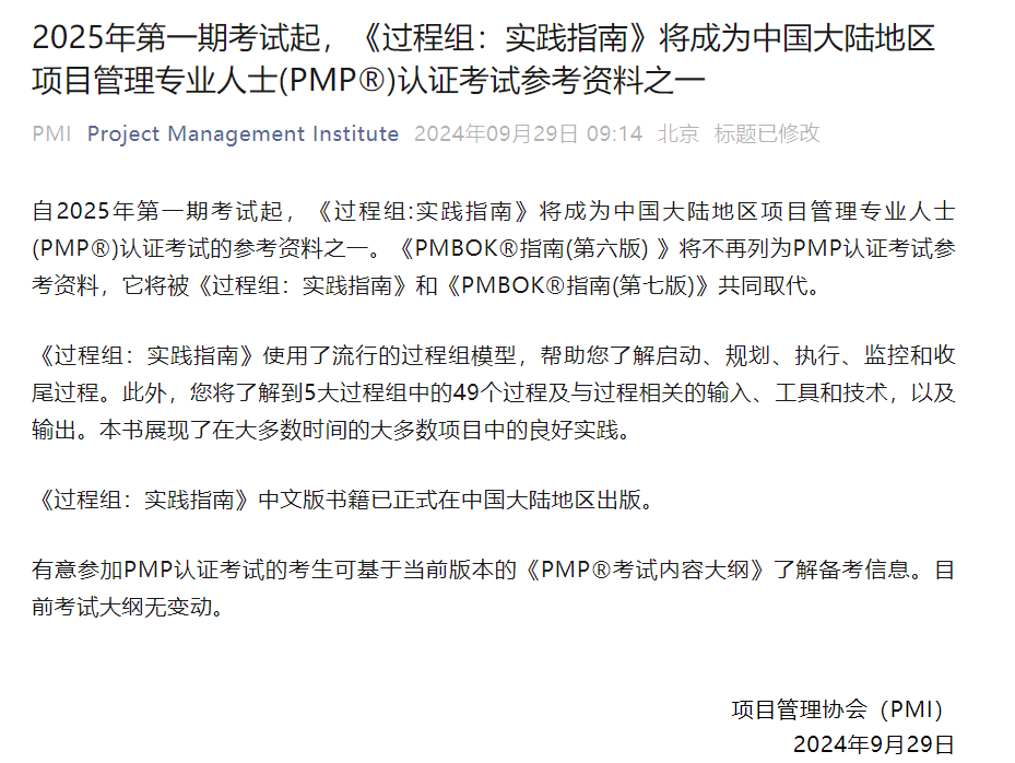 2024年9月29日,PMI?宣布25年3月考期開始,《過程組:實踐指南》(以下簡稱“PGPG”)和《PMBOK?指南(第7版)》將共同代替《PMBOK?指南(第6版)》成為新的考試參考資料。